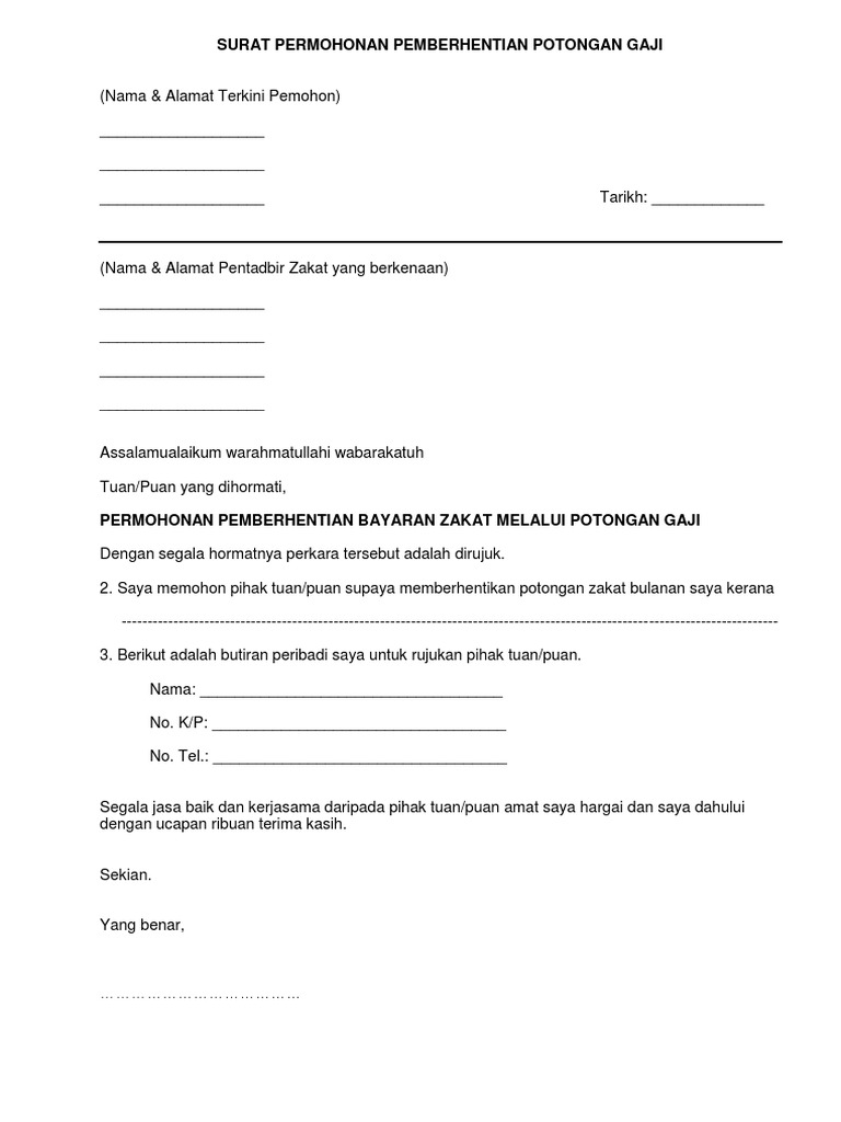 Surat Pemberhentian Potongan Gaji from imgv2-1-f.scribdassets.com Scopri ricette, idee per la casa, consigli di stile e altre idee da provare. Notis pemberhentian atau pemotongan elaun dan / atau overtime (ot). Bukti slip gaji sebelum dan selepas pengurangan diperlukan. Dokumen sokongan lain yang membuktikan pengurangan pendapatan seperti penyata bank. Contoh dokumen sokongan isinar kategori 2 bagi yang bekerja sendiri Jan 04, 2021 · notis pengesahan majikan berkenaan pemotongan gaji dan/atau elaun dan/atau tuntutan kerja lebih masa; Feb 17, 2021 · 1. Jika tiada dokumen ini, dokumen lain boleh dikemukakan sebagai contoh penyata bank ataupun surat pengesahan majikan.